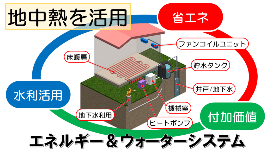 既設井戸をはじめ未利用熱エネルギーを有効活用することで導入コストを削減する事ができ、さらに再生可能エネルギーを活用した省エネ、省CO2排出システムを普及させ地球温暖化防止に貢献できるシステムを開発しています。
